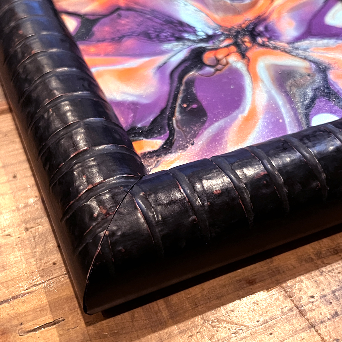 この作品はアクリル絵の具を使ったアクリリック・ポーリングアートで、独自配合のアクリルカラーと溶剤の反応で浮かあがるセル模様が特徴で、一般的なシリコンオイルを使用したポーリングアートとは違った趣です。